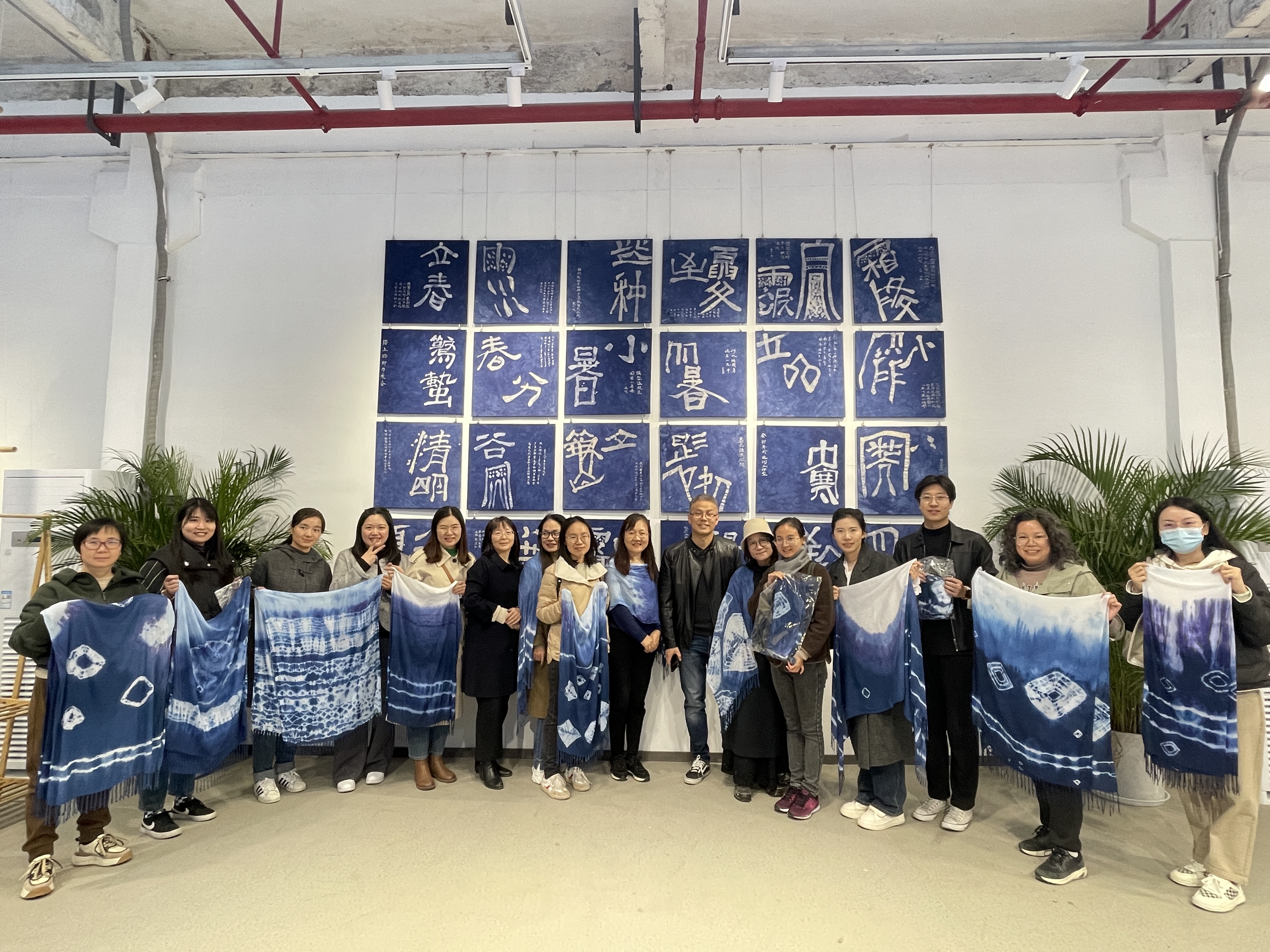 在实操环节,大家在白色围巾上设计创作,相互协助切磋手法,现场氛围轻松愉悦。经过捆扎、媒染、氧化、漂洗等扎染步骤,大家满怀期待将自己的扎染作品展开晾晒,一件件独一无二、富有浓郁民族风格的作品呈现在眼前,具有古朴意蕴的青白二色结合给人以“青花瓷”般的淡雅之感。
