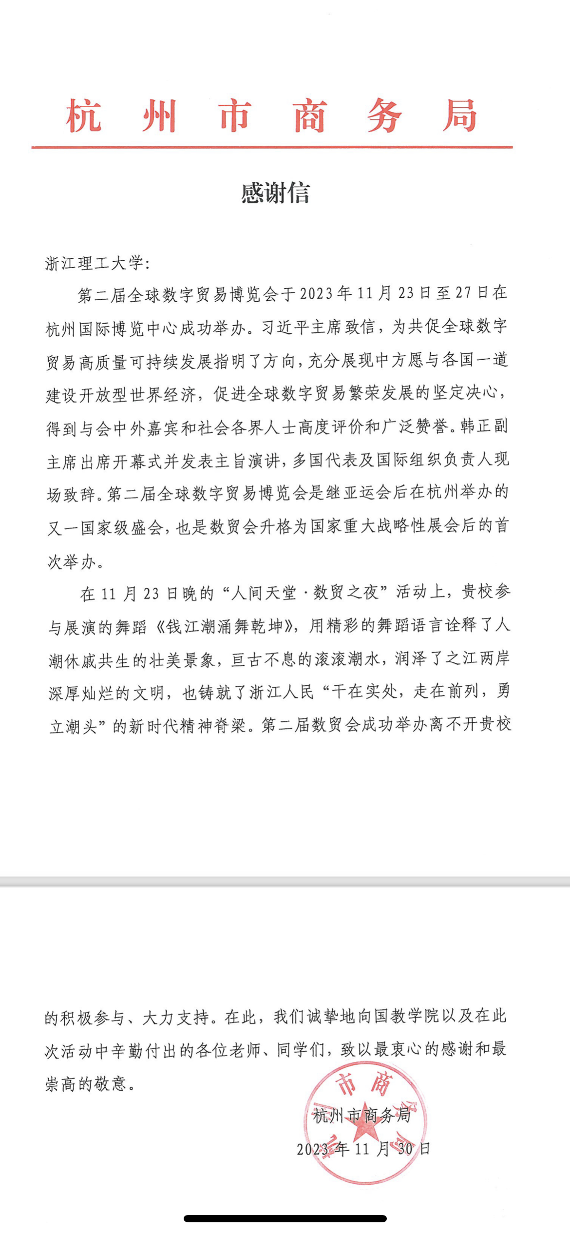近日,杭州市商务局向我校发来感谢信,感谢我校对第二届全球数字贸易博览会的大力支持。