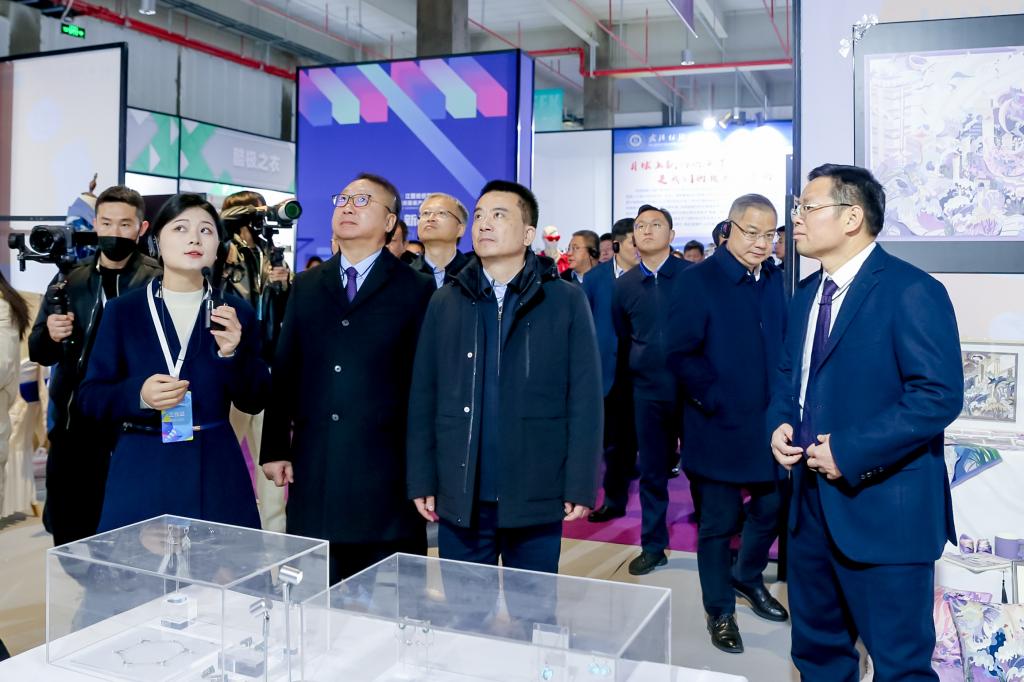 江西省副省长夏文勇、中国纺织工业联合会会长孙瑞哲、于都县委书记黄法参观服装学院展位作品