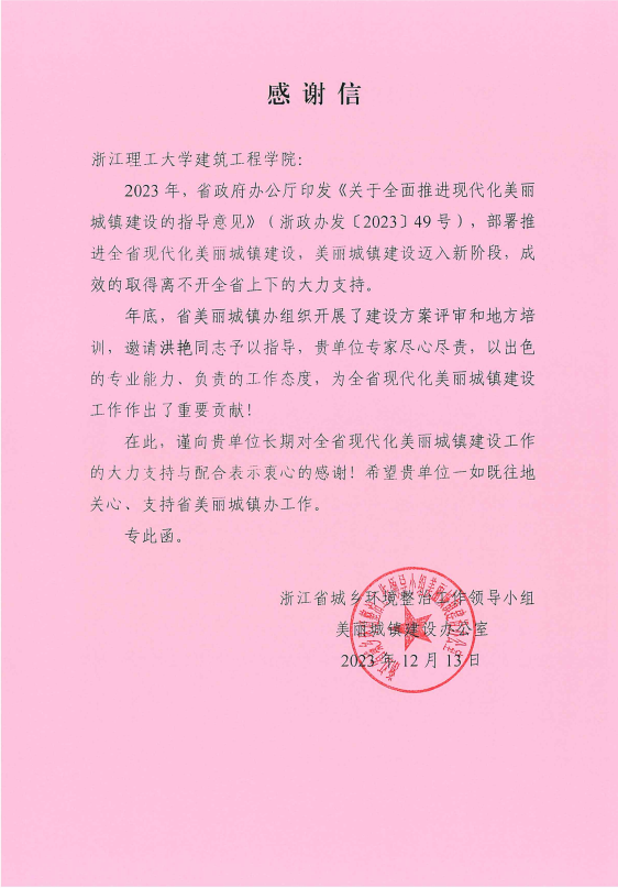近日,建筑工程学院收到一封来自浙江省城乡环境整治工作领导小组的感谢信。信中对建筑工程学院建筑系洪艳老师在“全省现代化美丽城镇建设”过程中做出的重要贡献给予了感谢。
