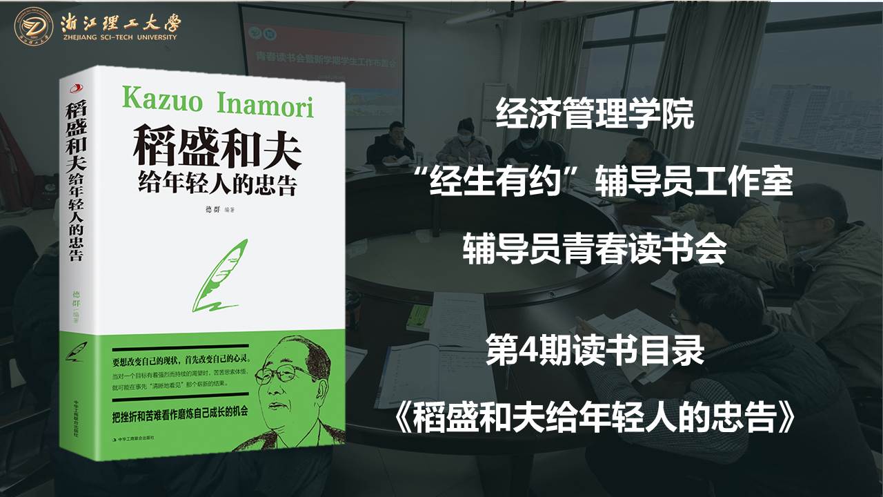 经济管理学院“经生有约”辅导员工作室青春读书会已连续开展4期,从《高校辅导员的七项修炼》的专业提升,到《习近平在浙江》思想引领,再到《软技能》中非技术性技能学习,如今第4期读书会《稻盛和夫给年轻人的忠告》的人生智慧,进一步促使“经生有约”工作室辅导员形成“多读书读好书会读书”的阅读理念,在书籍经典中汲取思想力量,为思政铸魂育人赋能增效。