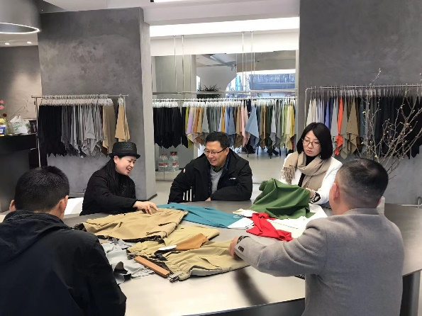 公司经理沈知峰首先对大家的到来表示热烈欢迎,带领大家参观了公司的生产车间、样品室以及销售门店,详细介绍了公司在面料开发、产业应用等方面取得的成果。表达希望能与mk官方网站_mk(中国)服装学院在产业服务、人才培养、科技研发、品牌拓展等方面开展合作的愿望。