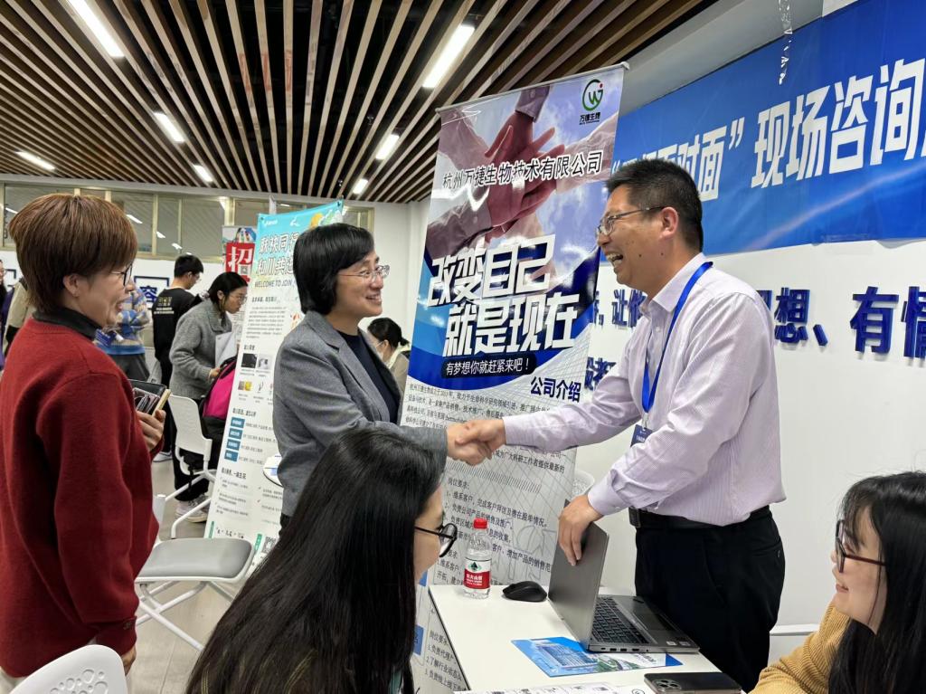 本次招聘会邀请了杭州联川生物技术股份有限公司、谁与医疗科技(杭州)有限公司、杭州九源基因工程有限公司、浙江杭康药业有限公司等众多知名企业前来参会,实现企业端和求职者的精准对接,为广大学子搭建实现职业梦想的大舞台。现场供需两旺,毕业生们积极投递简历,主动了解用人单位情况。企业代表细致了解毕业生专项技能、科研经历和项目经验,并对同学们关注的薪资待遇、工作要求与环境等问题进行详细解答。