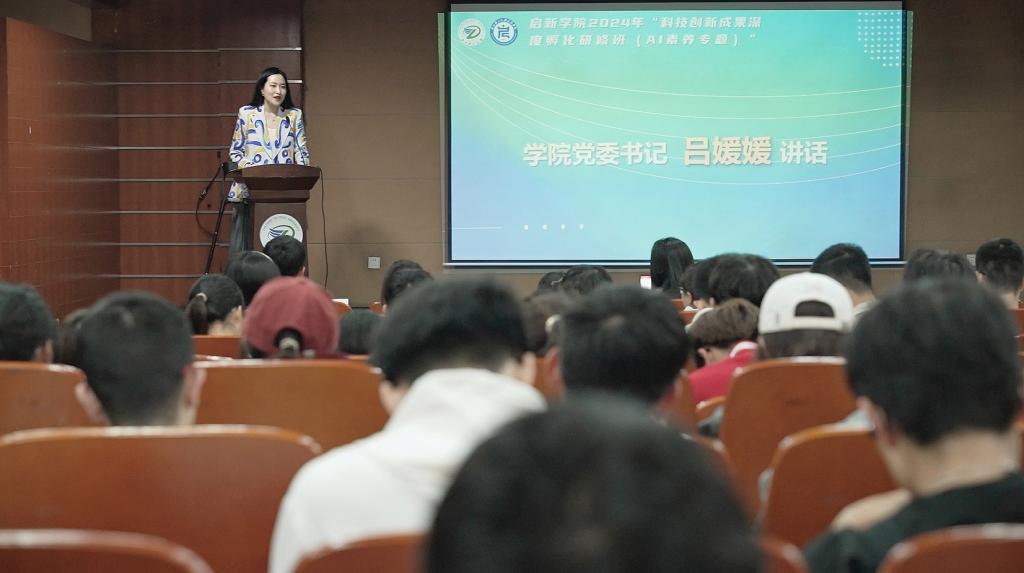 吕媛媛在讲话中强调了本次研修班的三个目标:一是帮助同学们把握科技趋势,认知人工智能如何推动社会进步,提升掌握、运用AI的素养;二是提升创新体验,打造科研创新第二课堂,提供理论学习、实习实践、专业体验等于一体的锻炼平台;三是明确主攻方向,在充分调研的基础上优化本科生导师制,遴选一批优秀导师,做好精准对接。同时她对同学们提出三点期望:一是要以转型为先导,提升AI技术的运用力;二是要以转变为关键,强化AI时代的适应力;三是要以转化为突破,激化AI创新的实践力。希望启新学子能够掌握AI这一未来社会所需的重要技能,成为学院发展新质生产力的重要人才支撑。