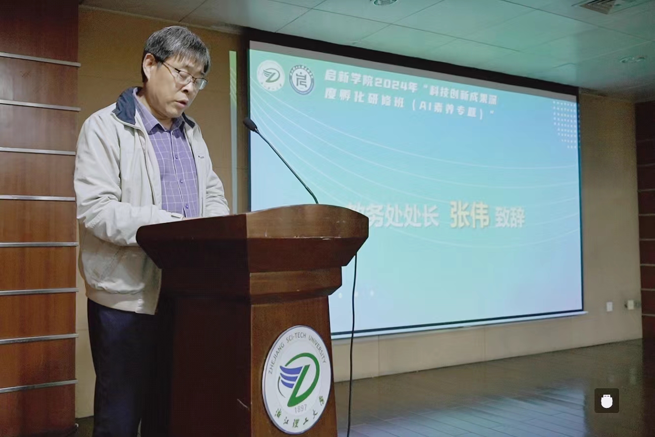 首先举行的开班仪式上,张伟出席并致辞。他指出,人工智能是新一轮科技革命和产业变革的重要驱动力量,加快发展新一代人工智能是事关我国能否抓住新一轮科技革命和产业变革机遇的战略问题。我校聚焦服务国家和区域重大战略,瞄准学术前沿领域,着力提升创新策源和科技服务能力,人才培养质量不断提升。作为培养新时代拔尖创新人才的荣誉学院,启新学院不断优化与专业学院协同培养机制,挖掘拓展优质教学、科研资源,联合业界导师团队,共同打造“AI素养专题”的课程体系,为同学们的未来发展提供了新的动力。希望同学们通过研修班的学习和训练,善于思考,勤于实践,学习、了解、走近人工智能,掌握先进的科学研究方法,把握专业学科新特点、新规律,争取产出更多的科技创新成果,为祖国、为社会、为人民奉献青春力量。
