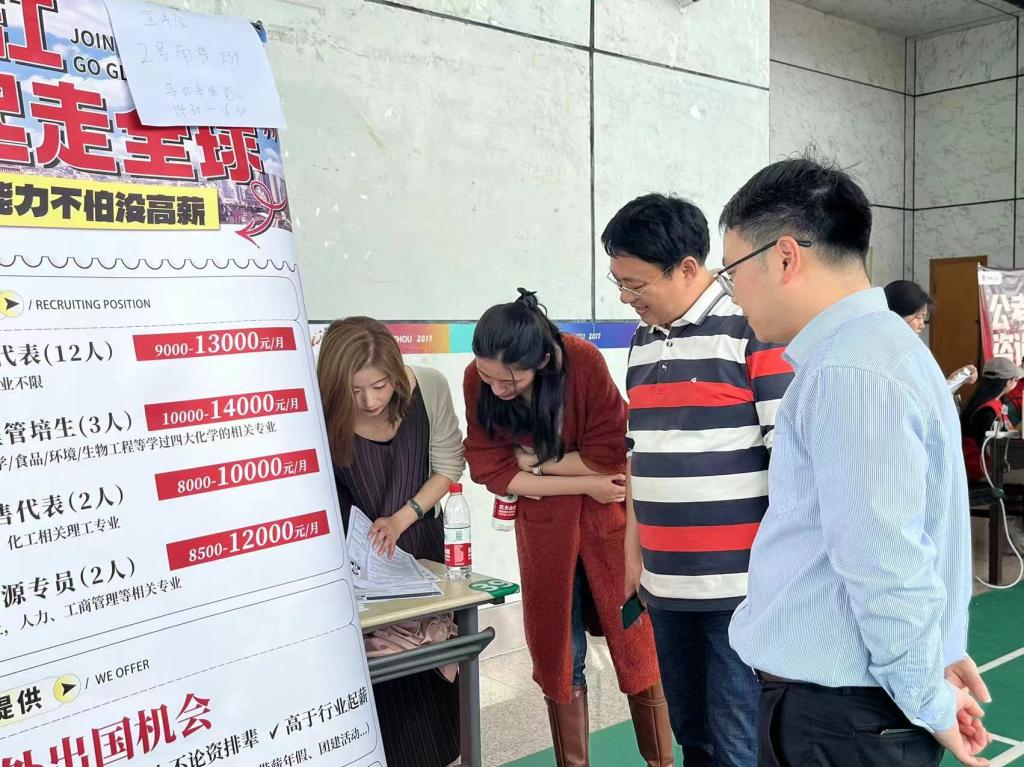 化学与化工学院党委书记施鹏,党委副书记王勇能一行来到招聘会现场,与用人单位深入交谈,了解目前市场需求与招聘进度。“我们已经收到多份简历了,有毕业生也有一些大三的学生过来找实习,现在学校和学生都非常重视就业,就业工作都前置了,我们公司目前研发类岗位基本满额了,市场类岗位缺口比较大,”瑞江化工招聘负责人说。施鹏等人也与同学们亲切沟通,询问毕业生求职进度,“我今天大概投了三份简历,之前也投过一些,有些被拒绝了,前几天杭州一家公司联系我,但是薪资方面还没有谈拢,”24届毕业生小李同学说。