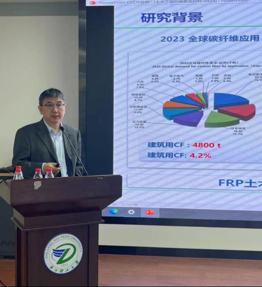咸贵军教授作题为“先进土木工程纤维复合材料及其应用研究”的报告,从先进土木工程纤维复合材料的研究背景出发,介绍了碳纤维复合材料加固钢管道、热塑性复合材料筋、FRP 耐久性研究等方面的研究成果,认为FRP土木工程应用是土木工程与纤维复合材料的重大机遇。