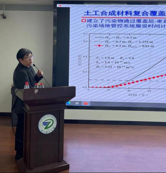谢海建教授作题为“土木合成材料在污染场地覆盖层中的应用”的报告。谢教授从我国存在众多填埋场和污染场地亟需评估修复的研究背景出发,介绍了覆盖层中土工合成材料的界面行为、土工合成材料复合覆盖层中污染物运移理论模型及其在实际工程中的应用。