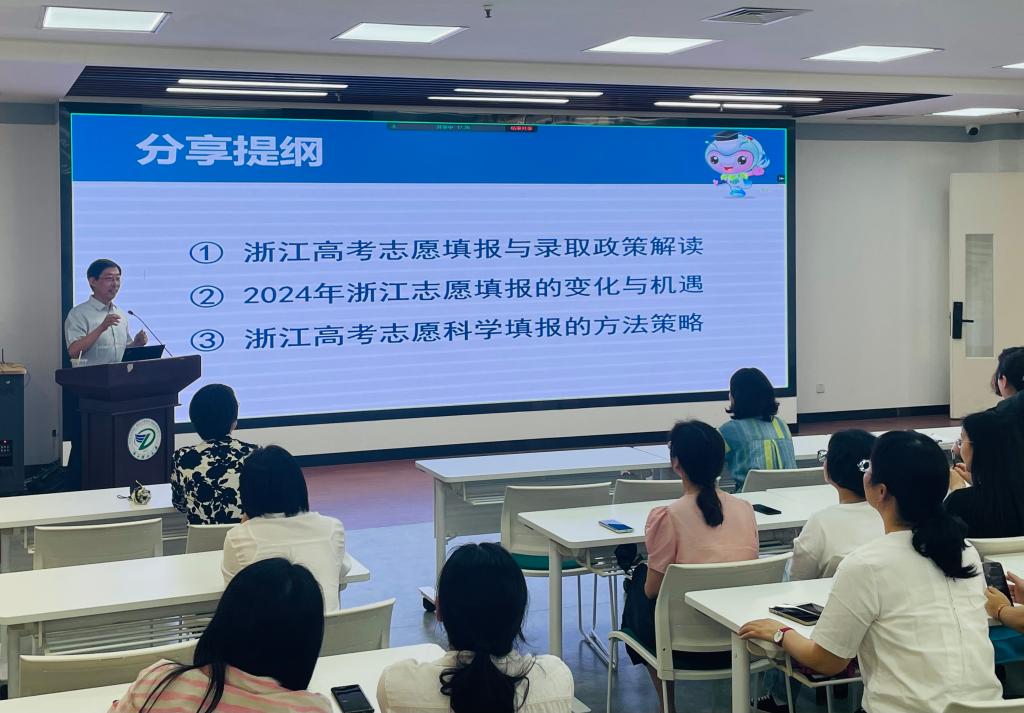 十年寒窗,只待一朝。为积极落实“我为群众办实事”,帮助广大教职工全面了解2024年浙江省高考志愿填报与录取政策、志愿填报策略等,助力孩子如愿进入心仪高校,5月23日中午,由校工会、妇联,教务处联合组织的《浙江高考志愿填报政策变化与方法策略》辅导讲座在下沙校区2N115致远厅举行,临平校区L4—416教室开启同步直播。两校区共吸引了近五十位教职工家长参加,讲座由校教务处副处长、继续教育管理中心主任高建明主讲,校工会、妇联常务副主席张信群主持。