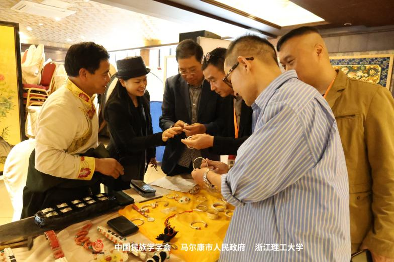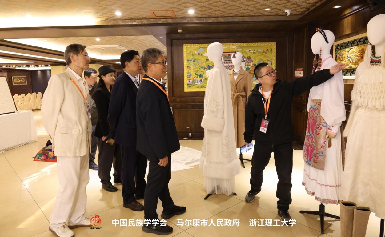 会议期间,与会领导和专家学者纷纷来到现场参观交流,须秋洁副院长陪同浙江省发改委二级巡视员曹启云、浙江省民委二级调研员蓝焰、马尔康政协主席昌旺、马尔康市委常委、副市长曹启蒙等领导参观,正在马尔康开会的中国旅游研究院战略所所长吴普、阿坝州文广体旅局副局长卞思雨等一行领导闻讯赶来,在马尔康市文体旅局服务中心主任薛伟和夏帆教授陪同下饶有兴致地观看了参展作品,还详细询问了设计师和非遗传承人跨界合作的事情,这次活动的发起人曹启蒙副市长亲自为来宾讲解展品中的设计亮点。参观者一致表示这些展品是一次比较难得的民族与时尚有机融合创新的范例。