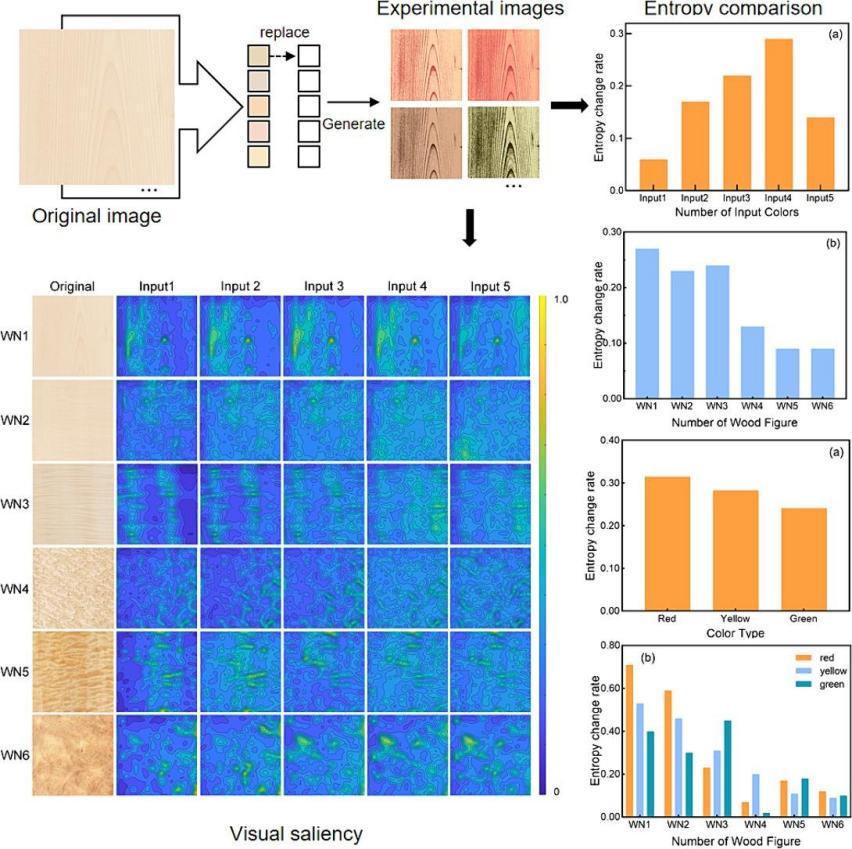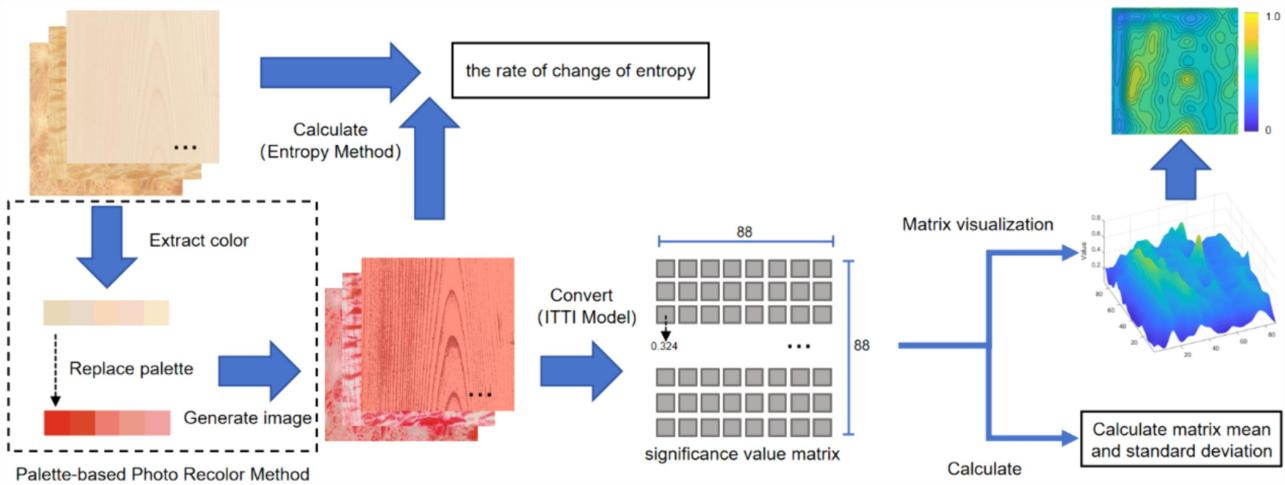 研究提出了智能着色与视觉模拟方法来探究木材材料表征在视觉感知中的变化(图1)。通过特殊的聚类方法,实现特定的图像颜色替换。这种替换方法可以在不干扰图像其他颜色的前提下对选定颜色进行替换。视觉模拟方法采用了视觉信息量与ITTI模型。这种方式的优点在于可以客观的计算材料表征的具体变化,并通过显著性图像观察视觉的感知情况。研究还同时设置了主观性评价,来对比人类直接的视觉感知与客观模拟数据的差异。
