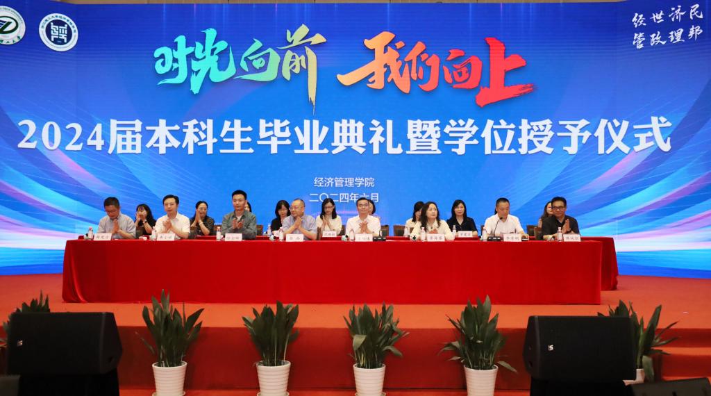 经济管理学院党委书记吕品,院长潘旭伟,副院长黄海蓉、奉小斌,党委副书记李孝明,党委委员、院长助理薛宪方,纪委委员、工会主席傅纯恒,各系主任、各办公室主任、毕业班班主任、辅导员和近百位毕业生家长出席典礼,典礼由李孝明主持。典礼在全体成员齐唱国歌中拉开序幕。