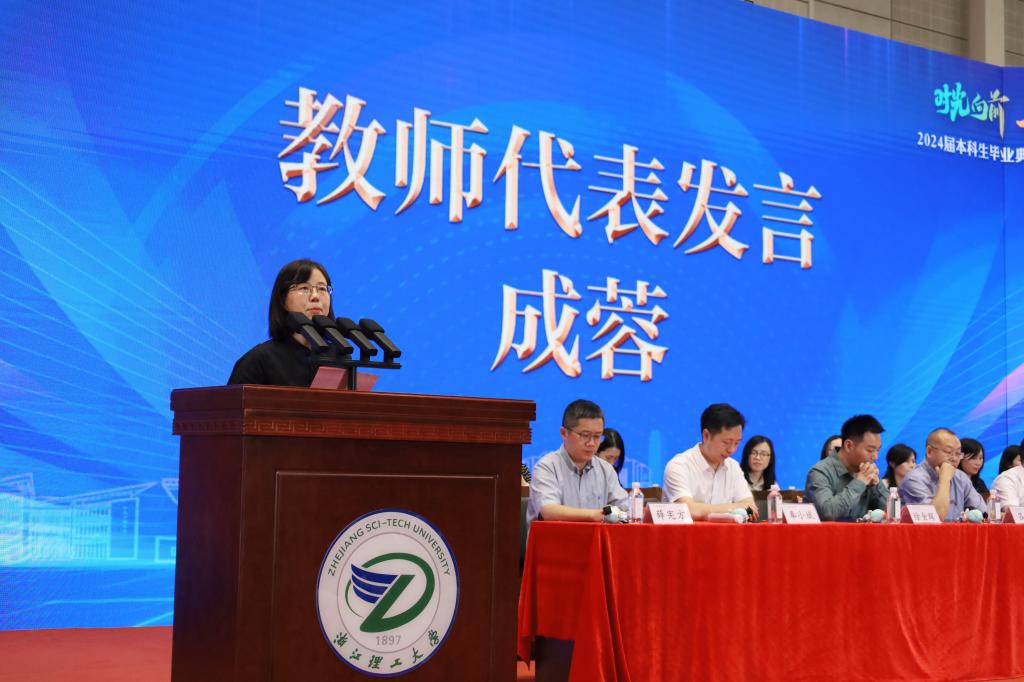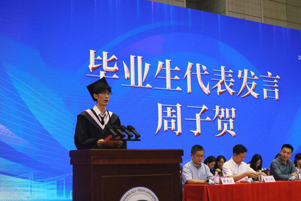 毕业生代表周子贺回首四载春秋寒暑,感恩母校的培养。他号召全体毕业生带着浙理的期望、老师的教诲、朋友的鼓励,砥砺前行,做怀揣梦想脚踏实地的人,做拥有智慧富有激情的人,做德才兼备敢挑重任的人,以青春之名,赴时代之约。