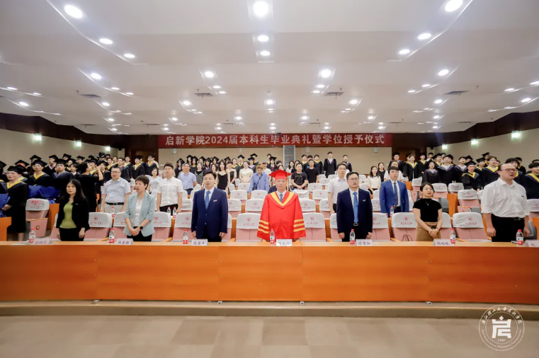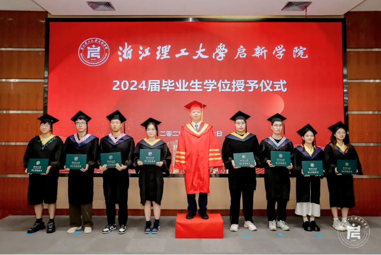 6月17日下午,启新学院2024届本科生毕业典礼暨学位授予仪式在下沙校区行政楼二楼报告厅举行。校长陈文兴院士,校党委副书记缪鲁加,副校长陈爱喜,2013届启新学院校友、浙江大学经济学博士、杭州森帛电子商务有限公司合伙人周咪咪,办公室主任陈善晓,党委学工部(学生处、人武部)部长胡琦,教务处副处长徐映红,招生与就业指导处处长梁琳,材料科学与工程学院副院长杨叶锋,信息科学与工程学院院长沈剑,以及启新学院党政班子全体成员、毕业班班主任等出席典礼。