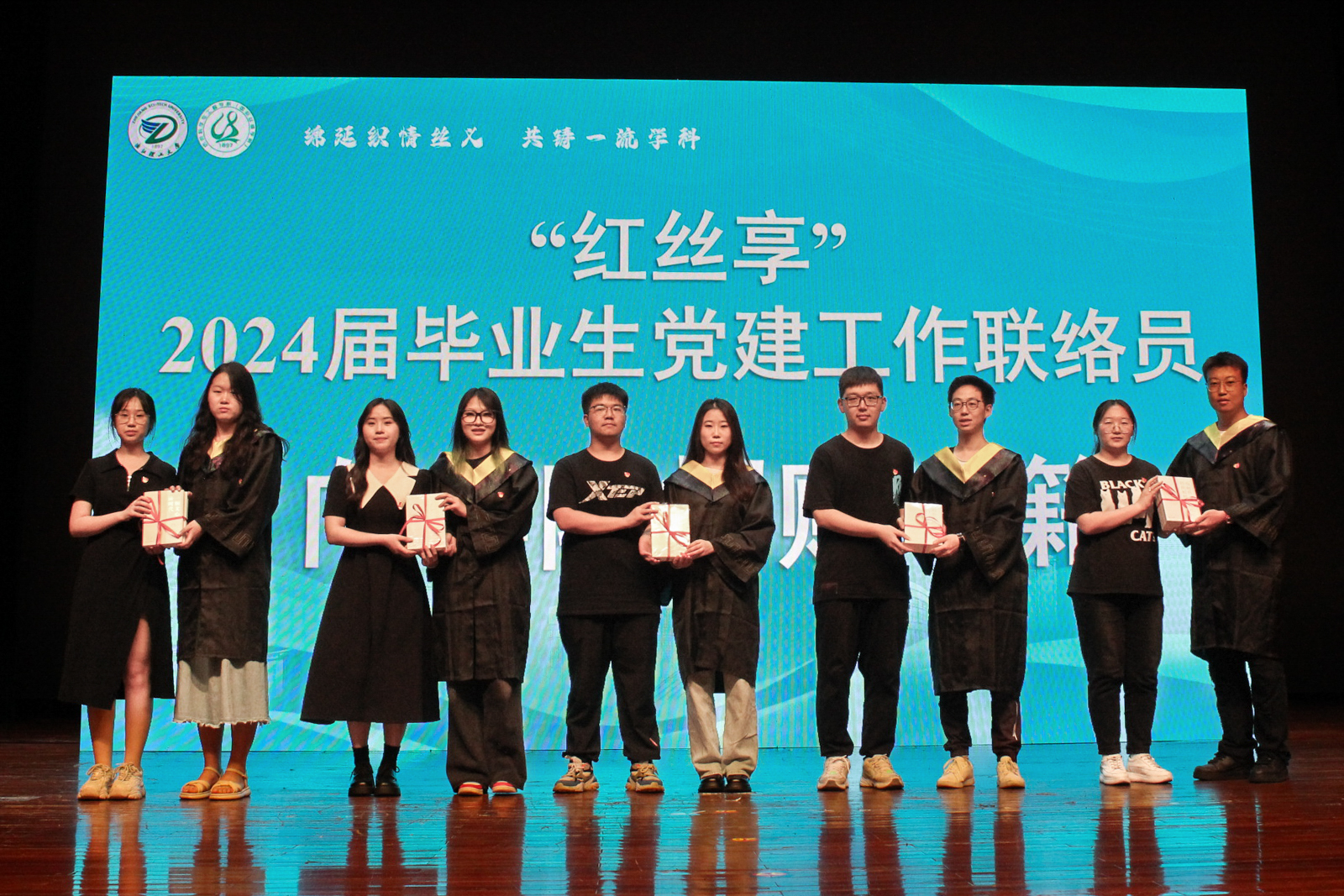 学位授予仪式后举行学院“一‘启’向未来”2024届本科生毕业典礼。学院党委书记吕媛媛为荣誉班主任颁发证书。副院长潘骏为各班获得启新“荣誉学员”的学生颁发了荣誉奖杯。