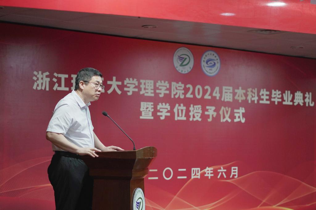 张云波为毕业生致辞。他代表学院向2024届毕业生表示热烈的祝贺,向悉心培育和指导同学们的老师和家长表示衷心的感谢。他回顾了毕业生在浙理的四年成长点滴,鼓励毕业生做心怀家国、担当有为、引领开拓、感恩奋进的理学人。他强调创新创造的重要性,鼓励毕业生牢记时代号召,勇担青春使命,努力成为新质生产力的创造者。