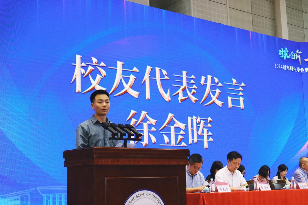 2024届校友联络会副会长于威武在毕业典礼上发言。他感谢学校和老师的培养,表示将和校友们一起建好校友会,助力校友和学院的发展。2020级应用物理学1班尹粒羽作为毕业生代表发言。她回顾了在浙理四年的成长故事,对学校、学院及老师们表达了最真诚的感谢,并真挚祝福学校和学院未来更加辉煌。