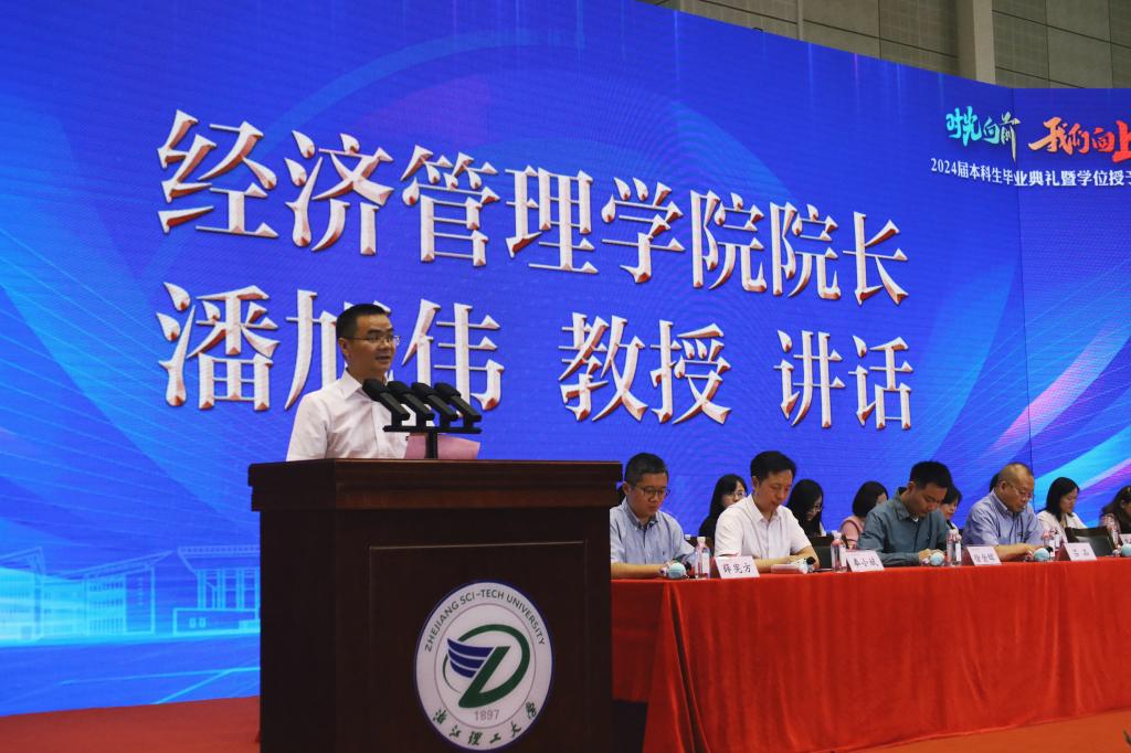 潘旭伟为毕业生致辞。他首先代表学院向同学们致以热烈的祝贺,并对悉心培育和指导同学们的家长与老师致以诚挚的敬意和衷心的感谢。临别之际,他向全体经管学子提出“走出经管 就要勇担使命”的期望。一是勇担使命就要勤善思,永奋进。希望同学们能够想起浙理的吉祥物“思思”勤善思,永奋进,保持对知识的渴望和追求,勇于提问、勇于探索。二是勇担使命就要知廉洁,筑根基。希望同学们需要坚守道德底线,不为名利所惑,不为物欲所扰,坚持理想信念,不忘初心,始终保持一颗清正廉洁的心。三是勇担使命就要立大志,担大任。希望同学们秉持“先天下之忧而忧,后天下之乐而乐”的情怀,为国家的繁荣富强、社会的和谐稳定贡献自己的力量,奏响时代的乐章。