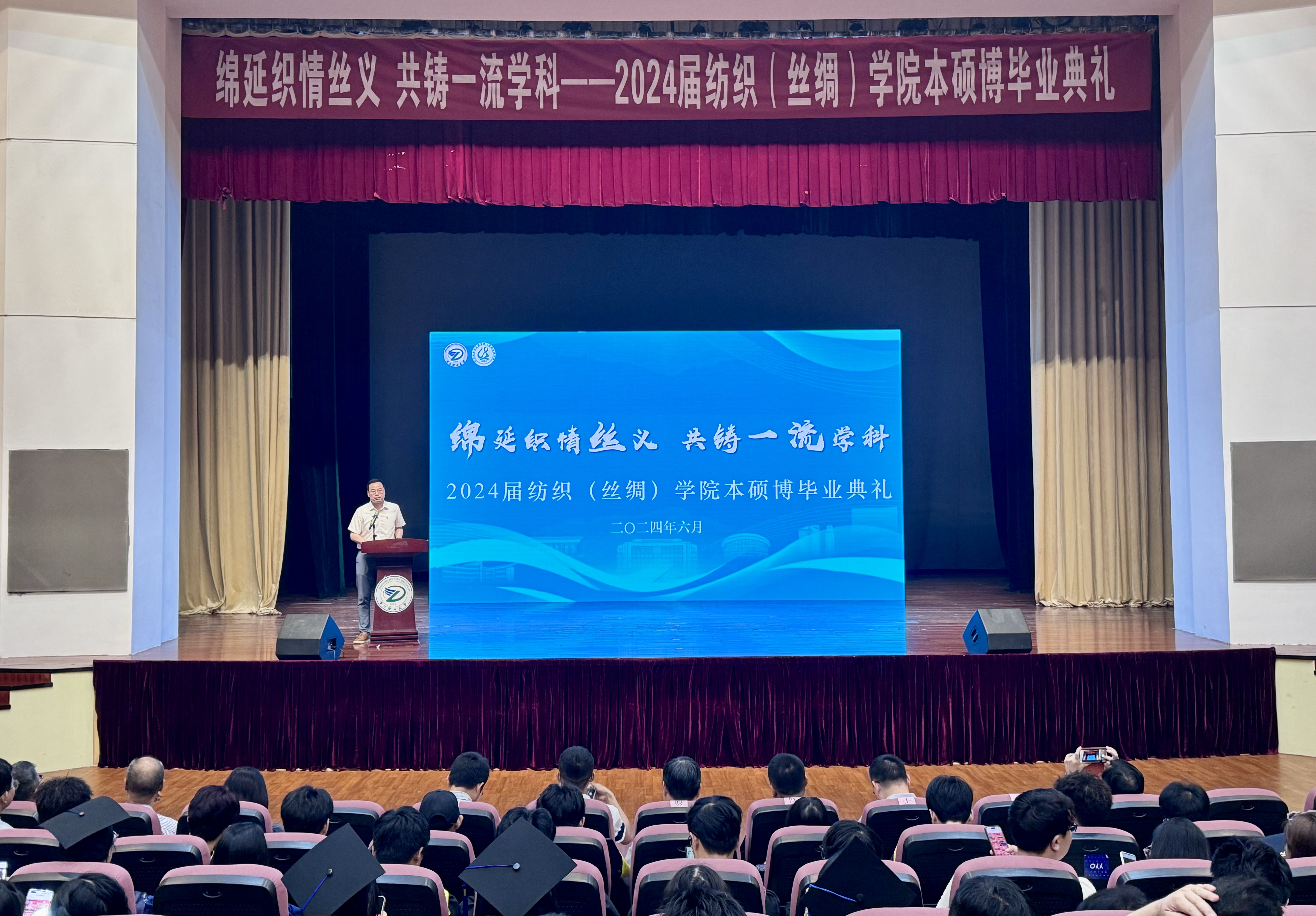 6月12日上午,纺织(丝绸)学院在下沙校区小剧院举行2024届毕业生毕业典礼。校友企业代表、浙江中大新佳贸易有限公司综合部经理刘峰受邀出席典礼,学院党委书记徐伟强、学院院长于斌、学院党委副书记方平、各系负责人、2024届班主任、硕博导师、辅导员、2024届本硕博毕业生以及低年级学生代表参加活动。活动由学院党委副书记方平主持。