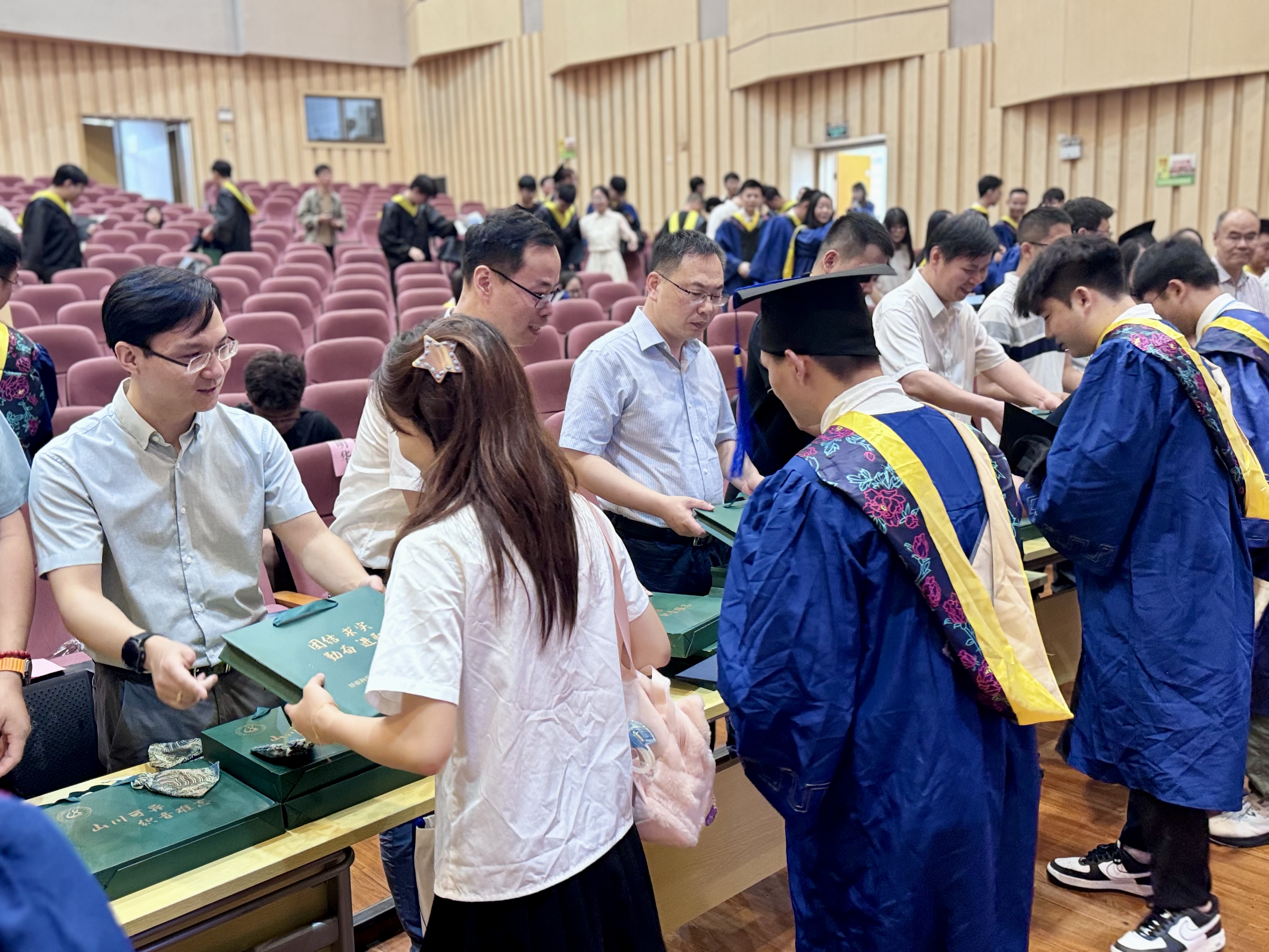 典礼最后,沈益、郭道友为毕业生代表赠送毕业纪念品。一枚枚刻印有理学院院徽、院训及“言有所戒,行有所止”的“廉洁书签”,希望全体毕业生在人生旅途中“心有所畏、自律自省”,书签在手上,廉洁在心中。