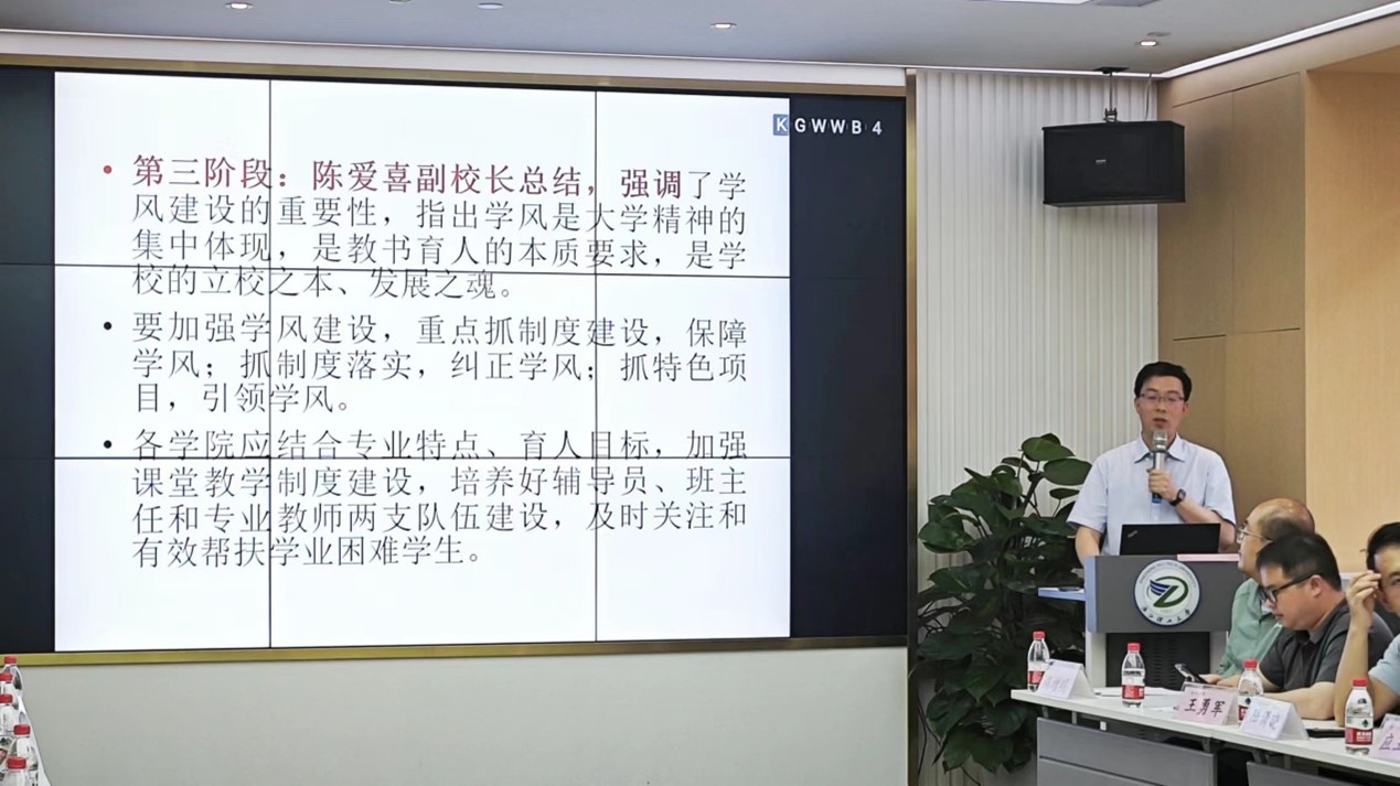杨叶锋向与会人员传达了学校本科教育教学工作例会暨筑学风促学业专题会议精神,通报了学院学生目前的总体学习状态,分享了学生学习问题、不及格课程情况和学业警示情况的数据,并分析了存在的问题和原因,提出了相关建议和举措。