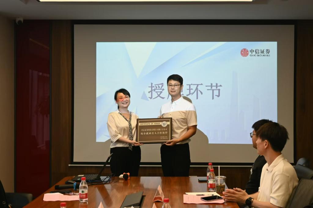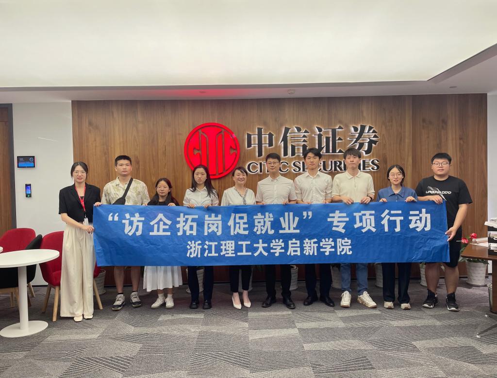 7月26日上午,启新学院、创业学院党委副书记赵凯鹏一行赴中信证券股份有限公司浙江分公司开展“访企拓岗”走访调研,就深化校企合作开展交流,并看望启新学院校友。中信证券浙江分公司人力资源部总经理翁淑芬,杭州延安路证券营业部负责人金依丽、诸暨东路证券营业部许旭校、杭州婺江路证券营业部朱喆,启新学院校友、中信证券杭州古墩路证券营业部团队负责人于熙臣及校招培训生凌一凡出席本次活动。学院学工办主任郭克楠、辅导员以及学生代表参加活动。
