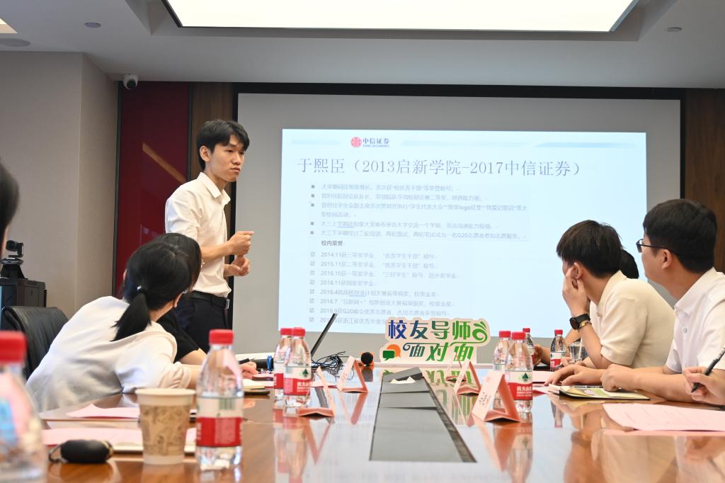 随后开展的“校友面对面”活动中,启新学院17届校友于熙臣结合自身学习经历、自身求职经验、现阶段工作内容进行分享,并就当前就业形势、行业发展趋势进行了深入分析,他勉励来访的学弟学妹不断提升自身的核心竞争,尽早明确就业方向和目标,树立正确的人生观、就业观,实现高质量就业。