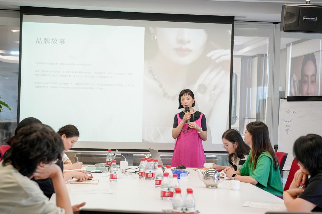 会上,胡总进一步介绍了企业的创始历程、品牌故事、产品美学等基本情况,翡拉拉设计师品牌已发展有15年历史,深耕中国文化和东方美学,目前在线上线下同步销售,线下拥有120多家门店。胡总评价时尚珠宝行业是一个“小而美”的行业,是一个“精致、另类、好玩、有趣”的行业,她强调,作为设计师品牌,要有十年磨一剑的精神,并提出打造具有东方美学的国际化原创设计师品牌的长远发展愿景,未来需要各类时尚人才力量支撑。
