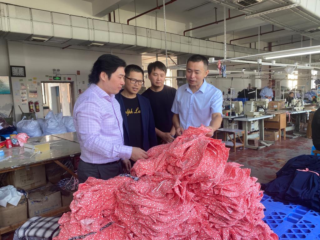 在义乌市佑宸服饰有限公司,公司总经理、00级服装设计与工程(中美)专业校友刘小安带领大家参观了公司生产车间和产品样衣。刘小安校友就公司成立的初心、运营模式和未来发展等方面进行了介绍,双方就人才培养、校友论坛等内容进行了探讨。