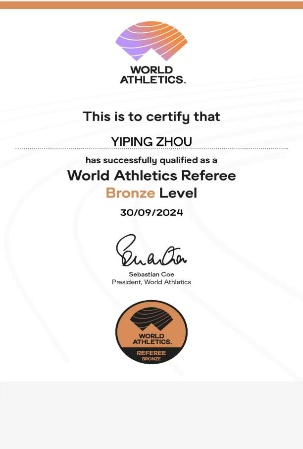 近日,世界田径联合会为我校体育教研部教师周意萍颁发了世界田联铜级裁判长证书,周意萍成为我校第一位田径国际级裁判,也是杭州市第一位田径国际级女裁判。本次国际级裁判考试由世界田径联合会组织,采用全球在线考试模式,考试证书终身有效。