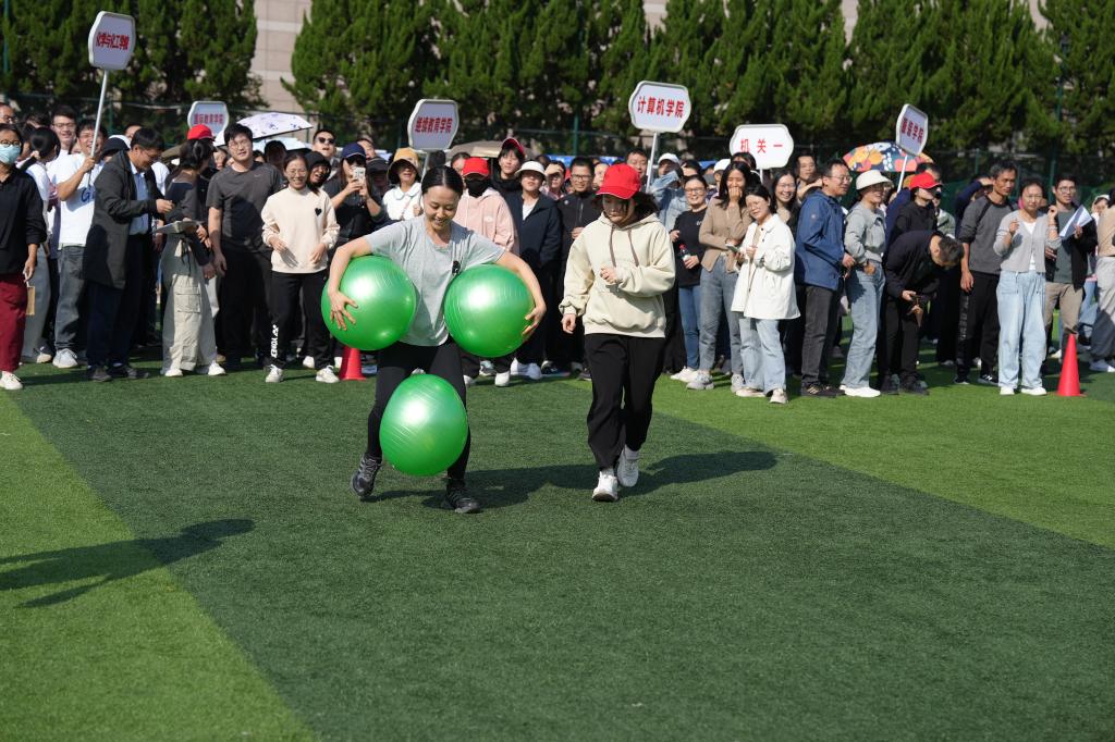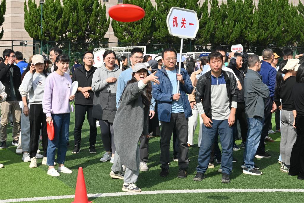 在“企鹅漫步”比赛中,老师们手脚并用夹着瑜伽球,奋力向前,萌趣可爱;随着裁判一声哨响,参加“极限飞盘”比赛的老师们抖动手臂,飞盘在空中划出一道道优美的弧线,无奈飞盘不听话,“降落”架内的寥寥无几;在“合力建塔”比赛中,大家屏气凝神,沉着冷静,用手中的丝线将团队配合发挥到了极致;“袋鼠搬瓜”的比赛场上,选手们身着五颜六色的袋鼠服,一蹦一跳开始瓜果争夺接力,场上呐喊助威声此起彼伏,气氛烘托到了高潮……