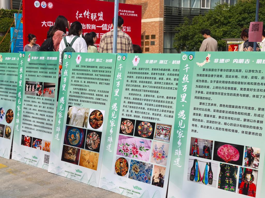 “杭绣,起源于汉代,至南宋时期达到鼎盛,其技艺精湛,令人叹为观止。”“苗族的刺绣和蜡染图案,讲究规整性和对称性,蕴含着丰富的民族文化内涵。”“汴绣则以国画和人物为主要题材,风格富丽堂皇、结构分明、针法细密,特色鲜明,深受人们喜爱。”活动现场,“三丝”励志志愿服务队成员们热情洋溢地向参加活动的学生们详细介绍着各种绣法的独特魅力。
