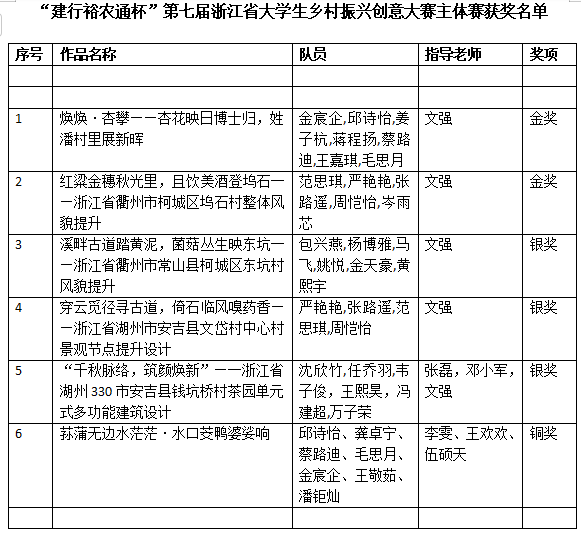 近日,由浙江省教育厅、浙江省农业农村厅、浙江省乡村振兴局、浙江省文化和旅游厅指导,浙江省大学生科技竞赛委员会主办的“建行裕农通杯”第七届浙江省大学生乡村振兴创意大赛主体赛决赛落下帷幕。建筑工程学院参赛团队不负众望,在1563支队伍中脱颖而出,共斩获金奖2项,银奖3项,铜奖1项。