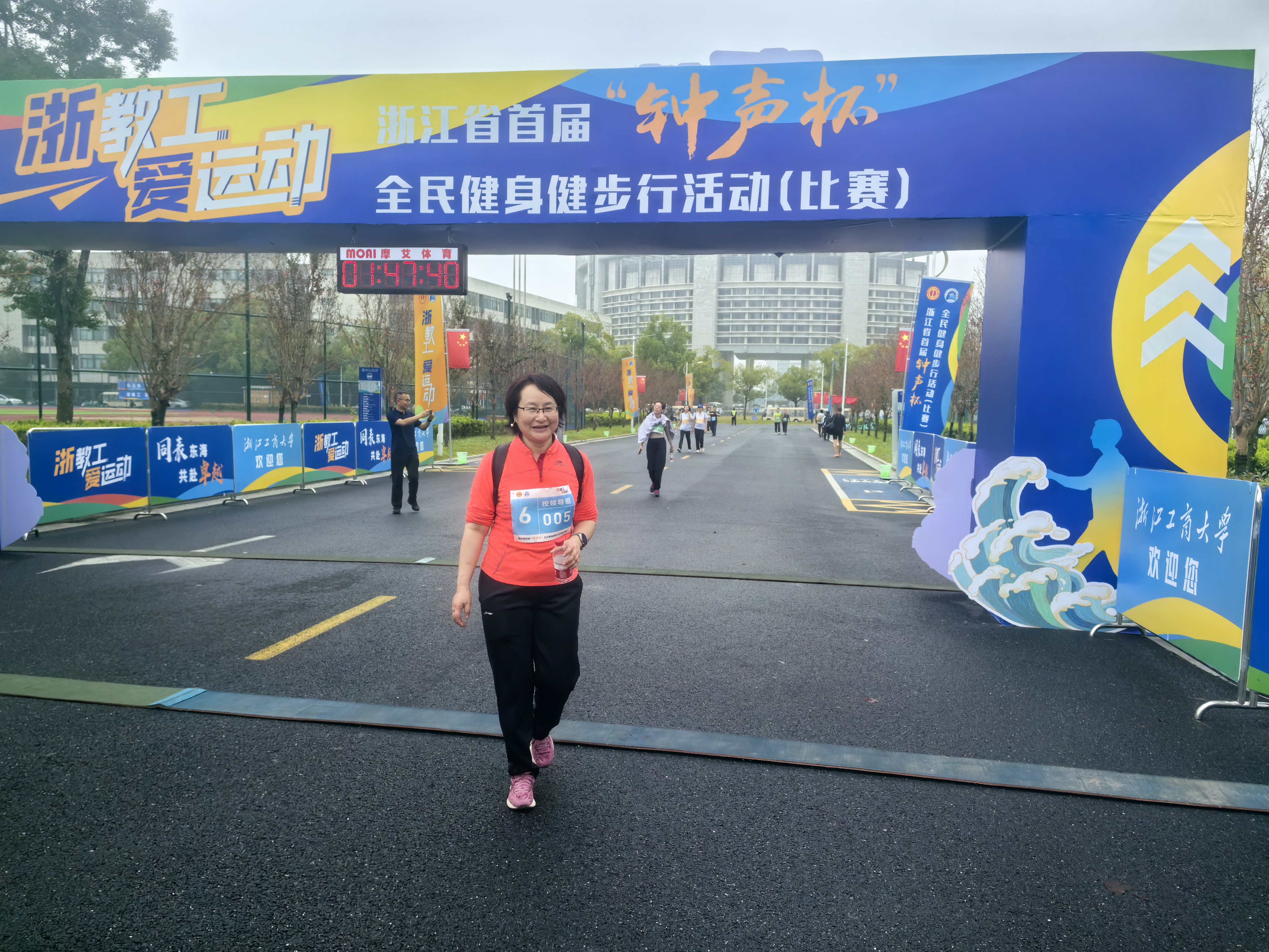 比赛日清晨,来自32所省内高校(单位)的800余名健步爱好者在雨幕中集结完毕。随着浙江省教育工会主席、省钟声体协主席王玉庆的一声令下,比赛正式开启。尽管天空细雨蒙蒙,寒风阵阵,但运动健儿们不畏风雨,疾步前行,一路热情似火!