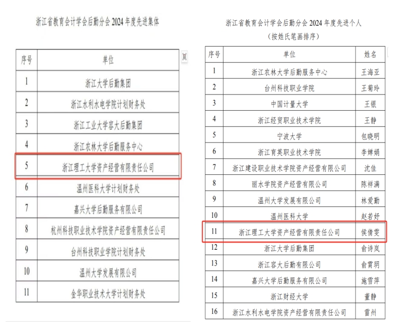 近日,浙江省教育会计学会后勤分会授予11个单位2024年“先进集体”称号、16名同志2024年“先进个人”称号。校资产经营有限责任公司获评浙江省教育会计学会后勤分会2024年度“先进集体”,校资产经营有限责任公司侯倩雯同志获评浙江省教育会计学会后勤分会2024年度“先进个人”。