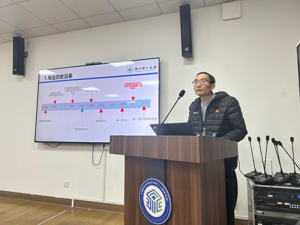 在专业建设汇报环节,计算机科学与技术专业负责人沈炜向与会专家汇报了国家级一流专业建设点的建设工作情况。沈炜从专业历史沿革、建设思路、建设成效三个方面进行了全面汇报,并回顾了近四年来取得的成绩,总结了当前存在的问题,并提出今后的发展设想。