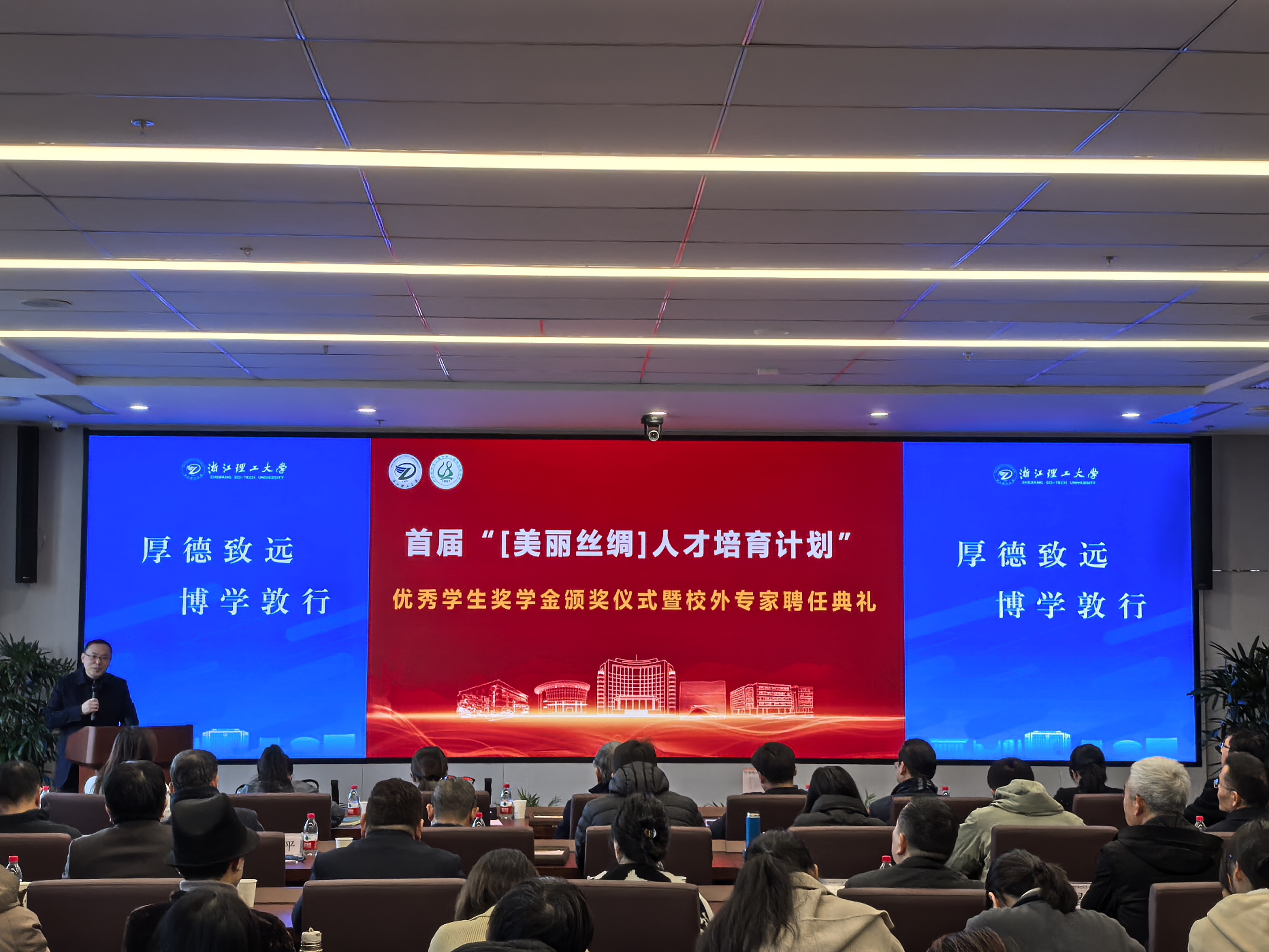 1月9日上午,由纺织(丝绸)学院和《丝绸》杂志社主办的首届“[美丽丝绸]人才培育计划”优秀学生表彰大会暨校外导师聘任仪式在mk官方网站_mk(中国)尚+大楼310报告厅隆重举行。校党委委员、副校长陈爱喜,mk官方网站_mk(中国)丝绸公益发展基金发起人费建明、顾新荣先生,《丝绸》杂志社、全国丝绸信息中心负责人,丝绸设计与工程专业校外专家、企业导师,校友企业代表,相关职能部门领导、纺织(丝绸)学院全体领导班子以及师生代表参加会议。仪式由纺织(丝绸)学院院长于斌主持。