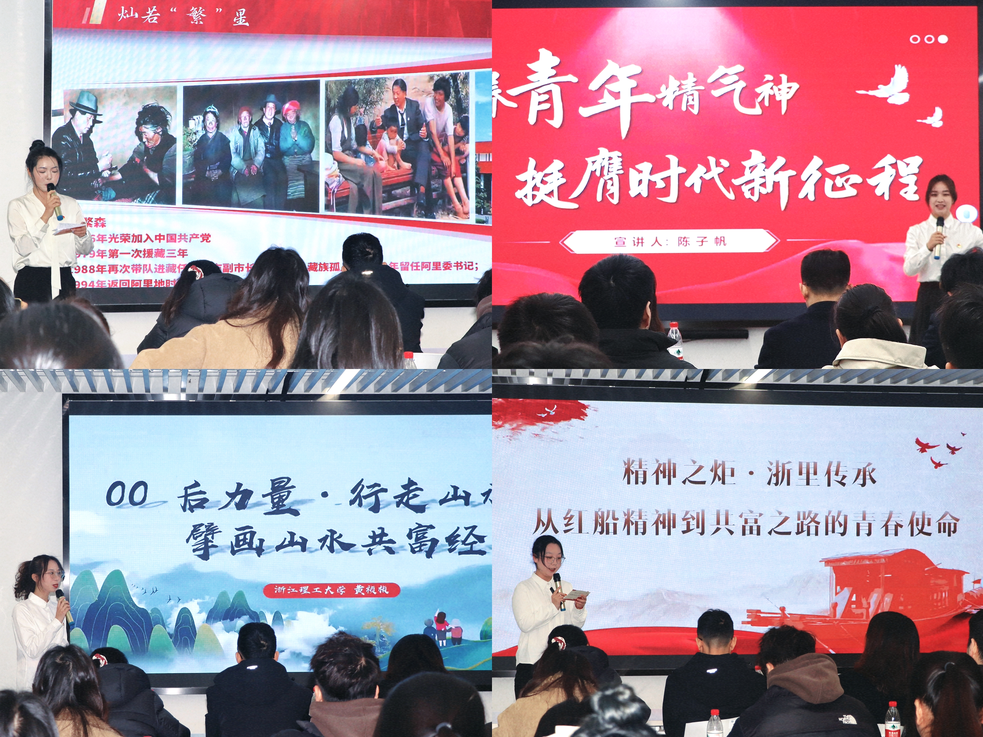 活动伊始,第二期硕博宣讲团团长李潇潇代表全体成员作2024年度工作汇报。她总结回顾了硕博宣讲团在理论学习、技能培训、实践交流等方面取得的成果,并对新一年硕博宣讲团工作进行了展望。第三期“红研青锋”浙理硕博宣讲团的四名宣讲员——理学院钟渊、外国语学院陈子帆、法学与人文学院范思瑜和黄祯桢进行了试宣讲。与会宣讲团导师从理论高度、结构层次、情感深度与宣讲技能等方面进行了深入点评与经验分享。