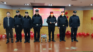 今年,宇树科技王兴兴校友给安全保卫部捐赠了一台机器狗,加入校园巡逻队,取名“平平”,编号“PA001”,并且由服装学院为其制作了工作服。本次团拜会专门为平平举行了入队仪式。应黎君和巡逻队代表与平平合影留念。