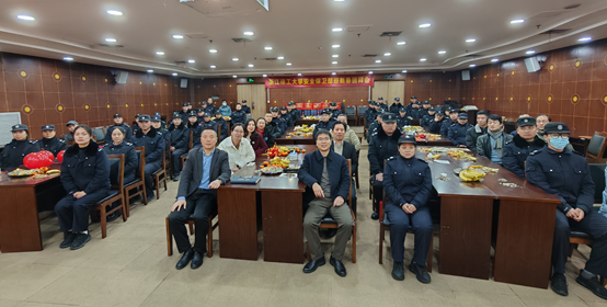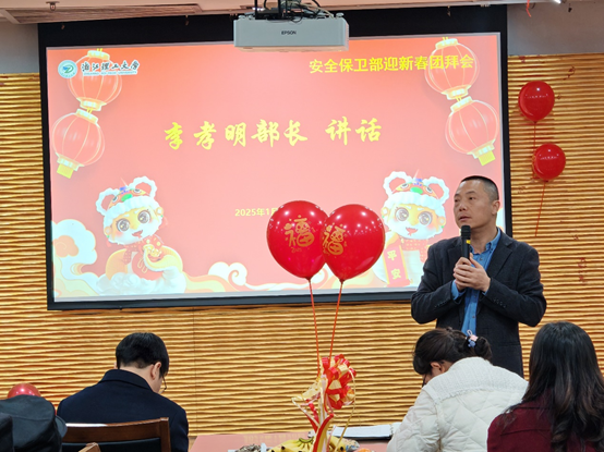 李孝明在团拜会上讲话。他指出,2024年是极为不平凡的一年,全体安保人冲锋在前、守责担当,圆满完成了年度校园安全保卫任务。安全保卫部所有的成绩离不开安保部和校卫队的支持,他对所有人员的无声坚守表示感谢,同时祝福大家在新的一年身体健康、一切顺利,一如既往贯彻落实上级要求,为平安校园建设交上满意答卷。