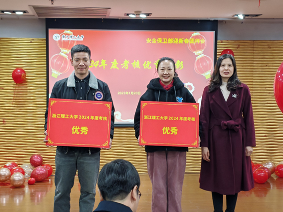 会议表彰了安全保卫部2024年度考核优秀人员、杭州市高校反诈宣讲培训优秀学员和2024年校卫队优秀队员。经安保部和机关党委考核评选,学校考核工作领导小组讨论,党委会审定,安全保卫部王雪静、谢春伟在2024年度教职工考核与评优中获评优秀。常海良同志参加了“在杭高校反诈宣讲师培训”,通过网络授课、集中面授、课后实践宣讲等形式学习,圆满完成了培训任务,被杭州市反电信网络诈骗中心评为“杭州市高校反诈宣讲培训优秀学员”。李妞为以上同志进行了颁奖。