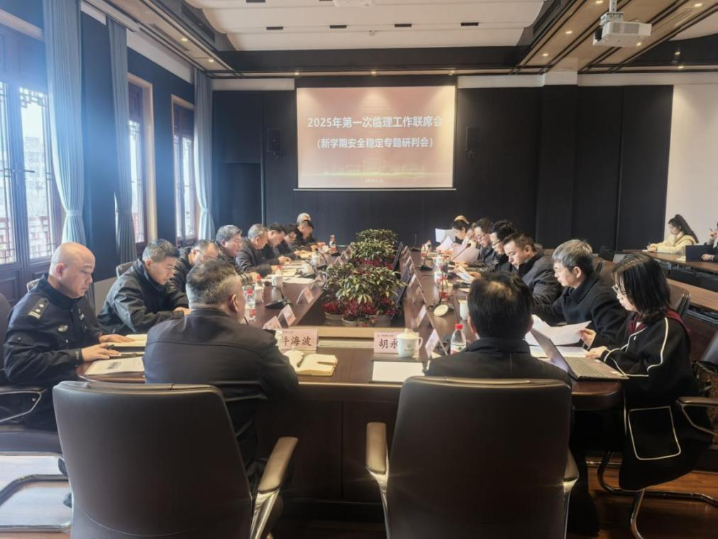 2月26日上午,临理工作联席会2025年第一次会议(新学期安全稳定专题研判会)在临平校区蚕学馆二楼会议室召开。临平区委政法委、统战部、公安分局政保大队、东湖派出所等单位(部门)有关负责人,学校宣传部、安保部、临平管办、国教学院和临平校区办学的四个学院负责人参加会议。临平管办主任方平主持会议。