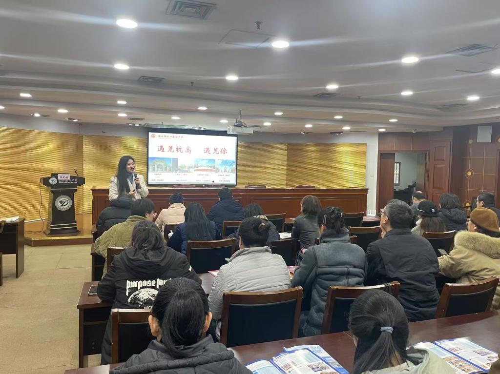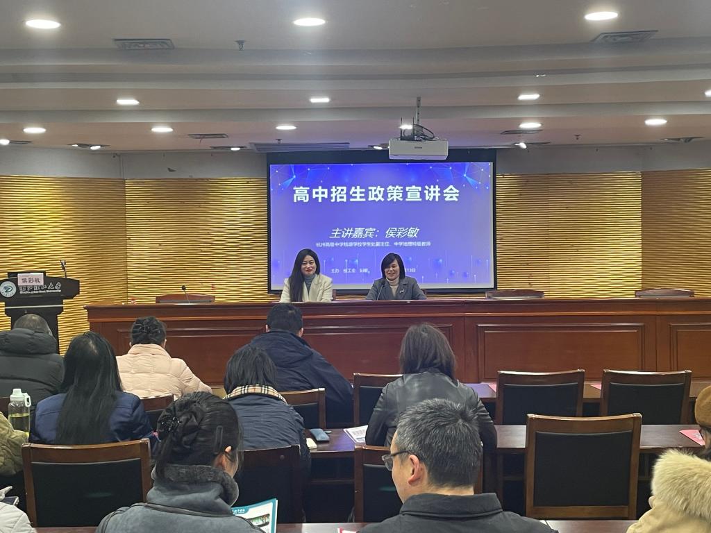 活动伊始,侯彩敏以“遇见杭高,遇见你”为主题向大家详细介绍了杭州高级中学四个校区办学情况及招考政策。介绍过程中,侯老师与我校参会老师积极互动,亲切交流,并送上杭高的相关文创产品。现场气氛活跃,大家认真聆听,不时记录关键信息。