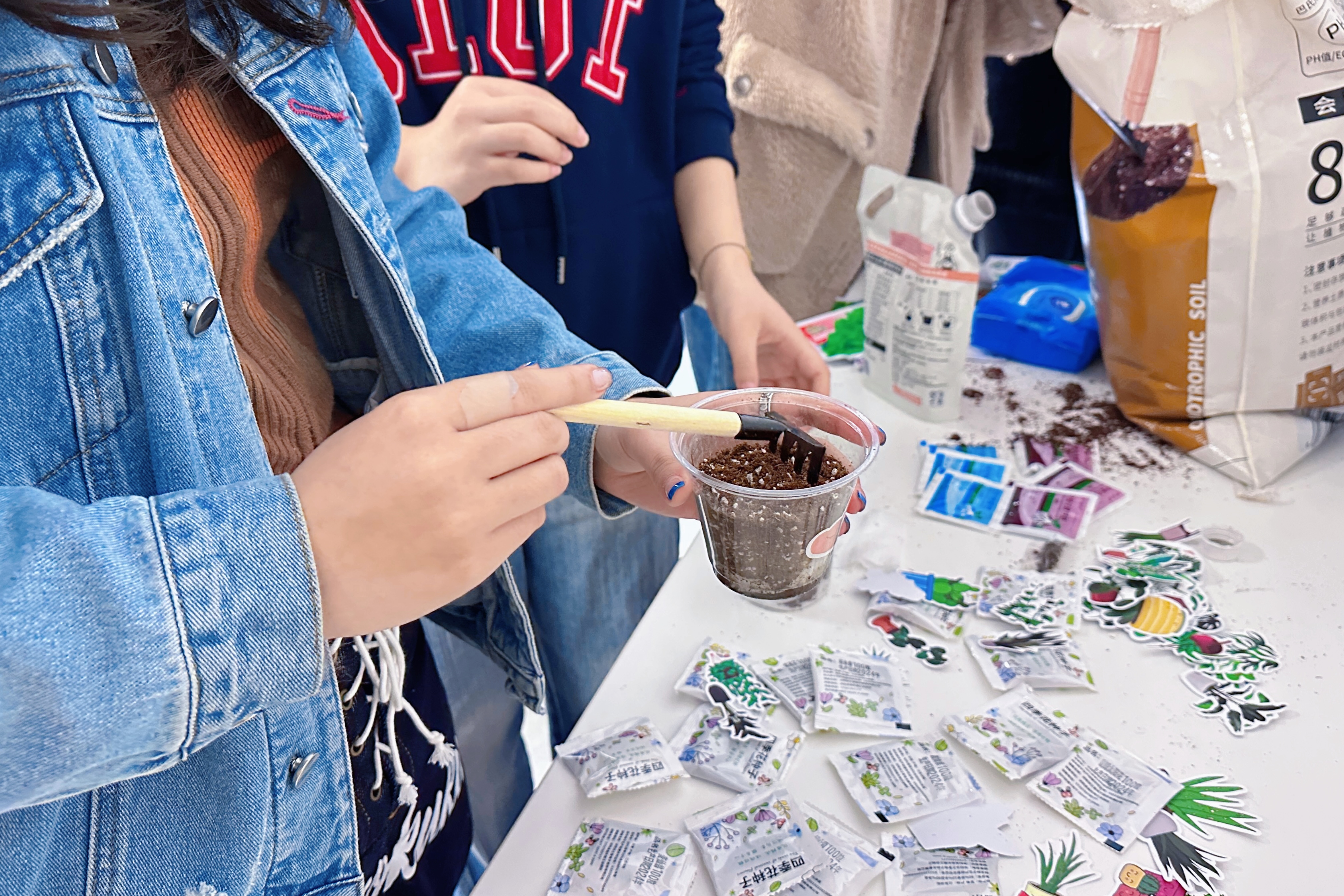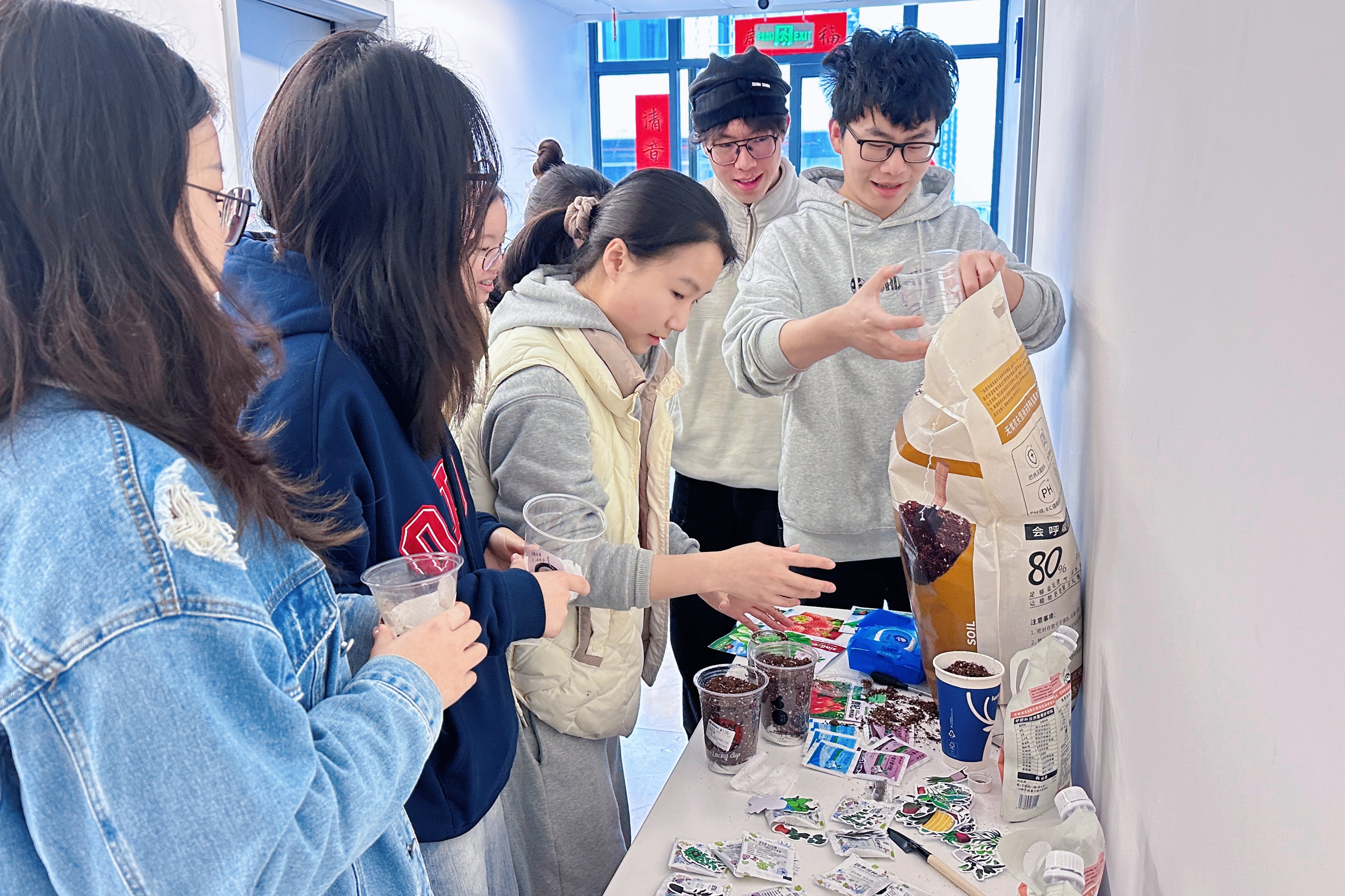 活动现场,同学们充分发挥自己的动手能力和创意灵感,首先将自带的奶茶杯仔细洗净,在杯底小心翼翼地扎好出水口,保证排水畅通,避免积水导致种子腐烂。随后在底部铺上湿纸巾,放入营养土、肥料和种子,贴上贴纸,一杯独一无二的专属的「高定种植杯」就完成了。