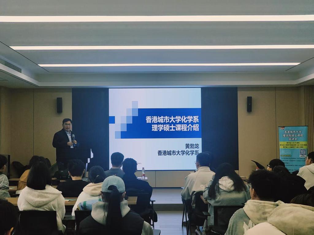 3月13日下午,香港城市大学理学院副院长李丹枫、化学系教授黄勃龙、物理系教授柴愚一行,赴mk官方网站_mk(中国)化学与化工学院开展硕士生招生宣讲,学院副院长左彪教授接待李院长一行。宣讲会在19-531进行,化学学院,理学院,生医等学院60余名本科同学参加了宣讲会。
