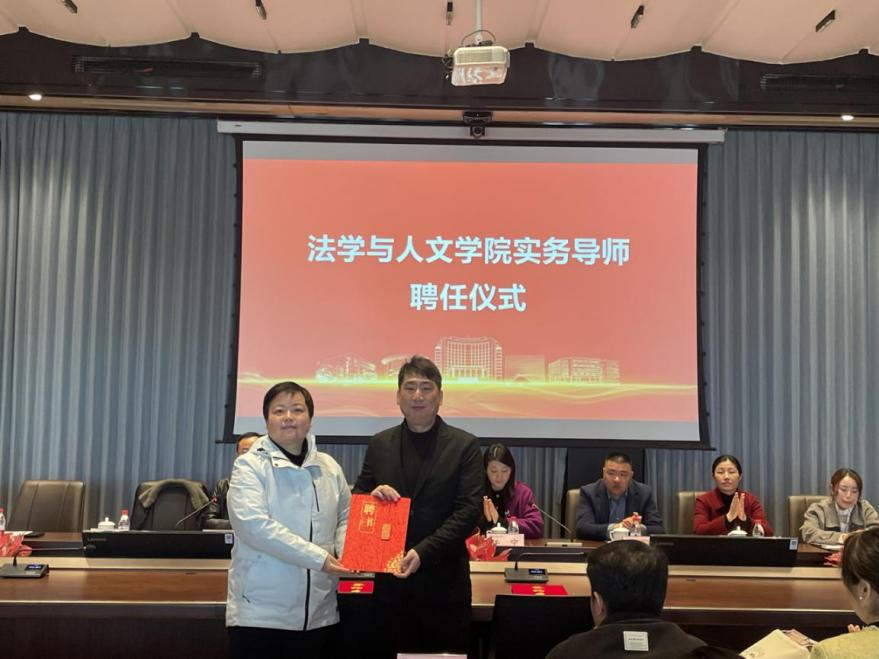 活动现场,法学与人文学院副院长(主持工作)李子瑾向民盟盟员、浙江初九律师事务所主任王巍颁发实务导师聘书,双方将共建协同育人基地,探索“律所+高校”人才共育新模式。