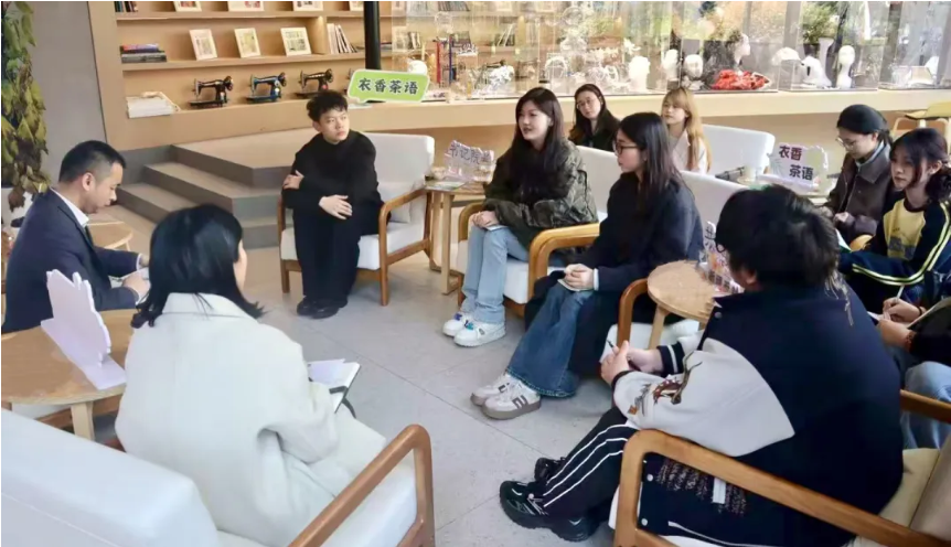 本期活动以“迎评促建,共话学风”为主题,通过师生面对面交流的形式,深入探讨学风建设路径,发挥榜样引领作用,凝聚共识,共谋发展。服装学院党委书记吴跃峰、副院长顾冰菲、党委副书记吴霁乐及学生代表参加此次活动。