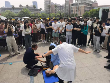 一名学生被困五楼天台,消防云梯车到达现场“空中救人”,医务人员就近设立临时救护站,对被救学生进行心肺复苏,并在现场进行心肺复苏培训。