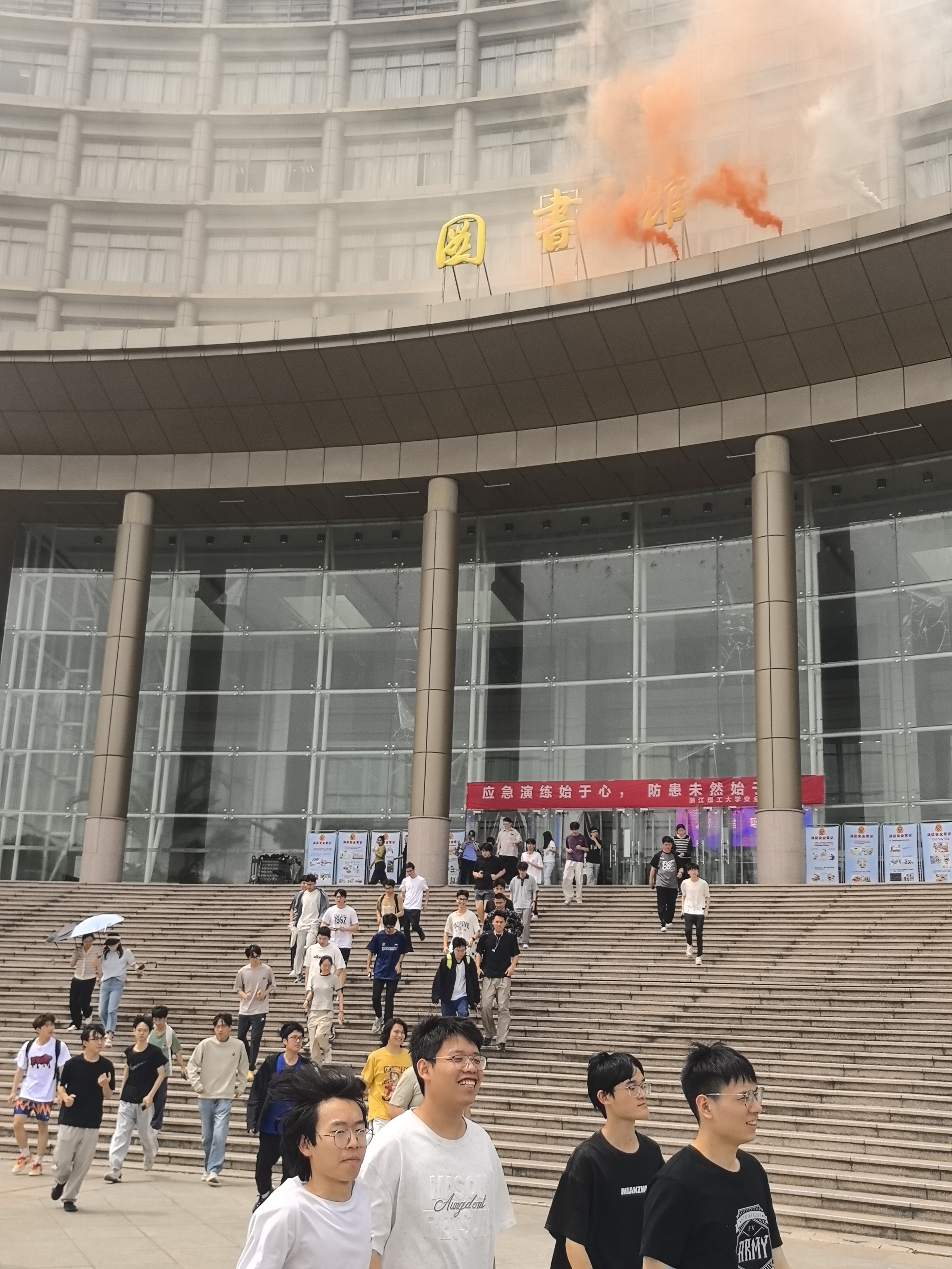 本次应急疏散逃生演练模拟图书馆五楼电子阅览室,因电器故障引发火情的场景,紧急疏散图书馆内的所有师生员工。