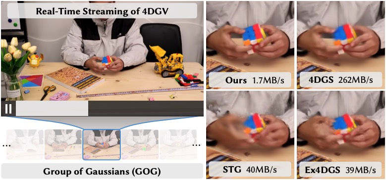体积视频(Volumetric Video)被誉为下一代沉浸式媒体的关键支撑技术,但因其“高存储、高带宽”的天然“体量”,一直难以应用于寻常场景。此次浙大×浙理工团队提出的新方案,将四维高斯点云作为动态场景的表达核心,并引入了“视频分组,动静分层”的建模思路—将整个视频拆分成一组组由静态与动态点云构成的高斯点组(Group of Gaussians),让时空表达更有条理也更高效,便于在时间轴上实现分段式建模。